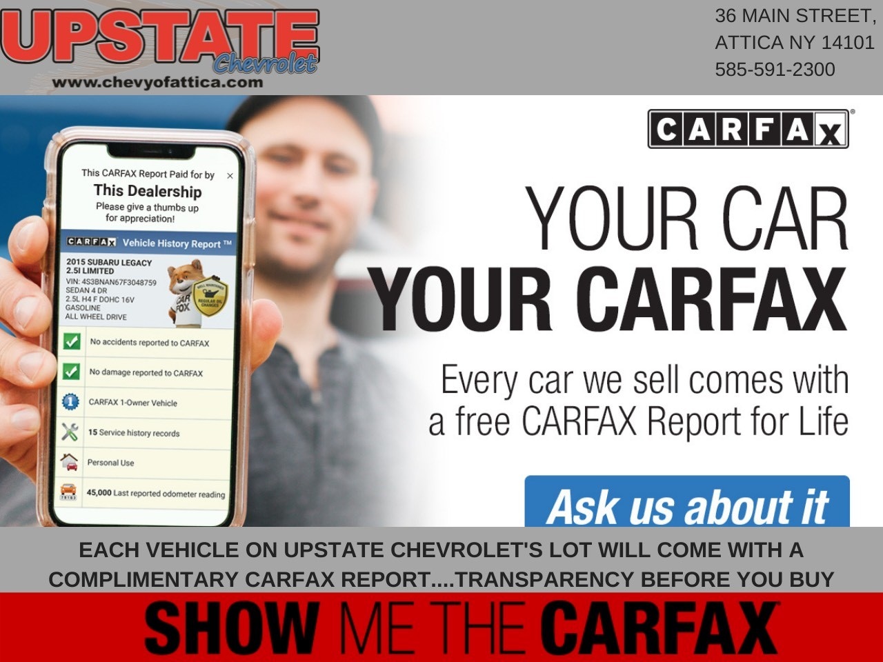 Upstate Chevrolet is your used car dealership of choice with a huge selection of pre-owned vehicles in great condition. Take your time when browsing through our latest used vehicles online and give us a call at (877) 463-0897 or contact us online if you have any questions about one of our vehicles. We're always adding used cars to our inventory so check back frequently or ask us if we have any interesting new arrivals. You can also take most of your used car shopping experience online by using Upstate Quick Quote. Save time at the dealership by creating a deal and visiting our Attica car dealership for a test drive, signing papers and driving home your next vehicle.